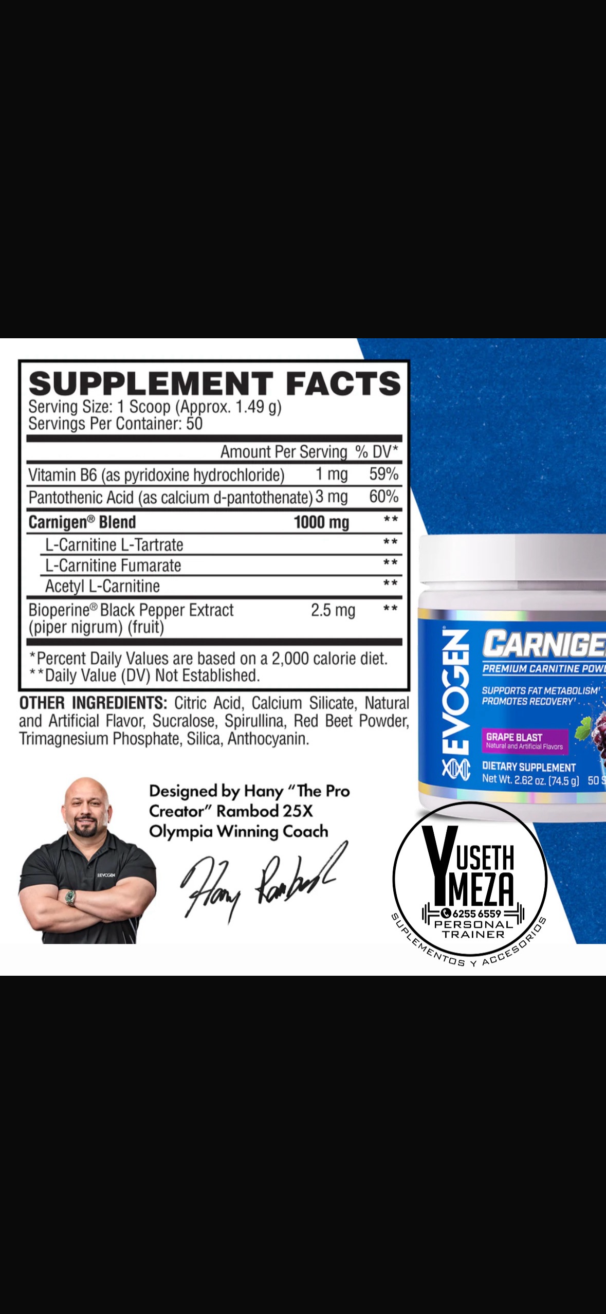 Evogen Nutrition es conocida por su pura innovación y sus suplementos fuertes. Carnigen® es la última mezcla de carnitina sin estimulantes, ultra-premium y potente, que utiliza la última tecnología de formulación de carnitina para ayuda a encender su potencial de trituración. Para mejorar la absorción, Carnigen® cuenta con vitaminas, minerales y potenciadores de biodisponibilidad clave para desatar sus efectos dramáticos. Es la solución perfecta de control de peso para usar antes del cardio o el entrenamiento.
