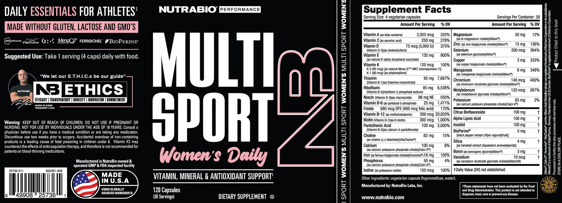MultiSport for Women es una fórmula avanzada, terapéuticamente dosificada de vitaminas, minerales y antioxidantes diseñada específicamente para satisfacer las mayores demandas de micronutrientes de las atletas femeninas. En un mundo perfecto, los atletas consumirían una dieta bien equilibrada que contuviera granos enteros, frutas y verduras, ayudando así a garantizar la ingesta adecuada de todos los micronutrientes. Desafortunadamente, en el mundo real, los atletas no tienen dietas perfectas. En la sociedad actual, la falta de tiempo y la conveniencia de fuentes de alimentos menos que ideales tientan a las personas a comer una dieta que carece de muchas de las vitaminas y minerales esenciales necesarios para mantener un estilo de vida saludable y un rendimiento del combustible. Si la dieta de un atleta es menos que favorable, se recomienda que tome una multivitamínica de alta calidad como una forma fácil y rentable de garantizar la ingesta adecuada de todos los micronutrientes esenciales. Es por eso que NutraBio, el nombre más confiable en nutrición deportiva, desarrolló MultiSport para mujeres.