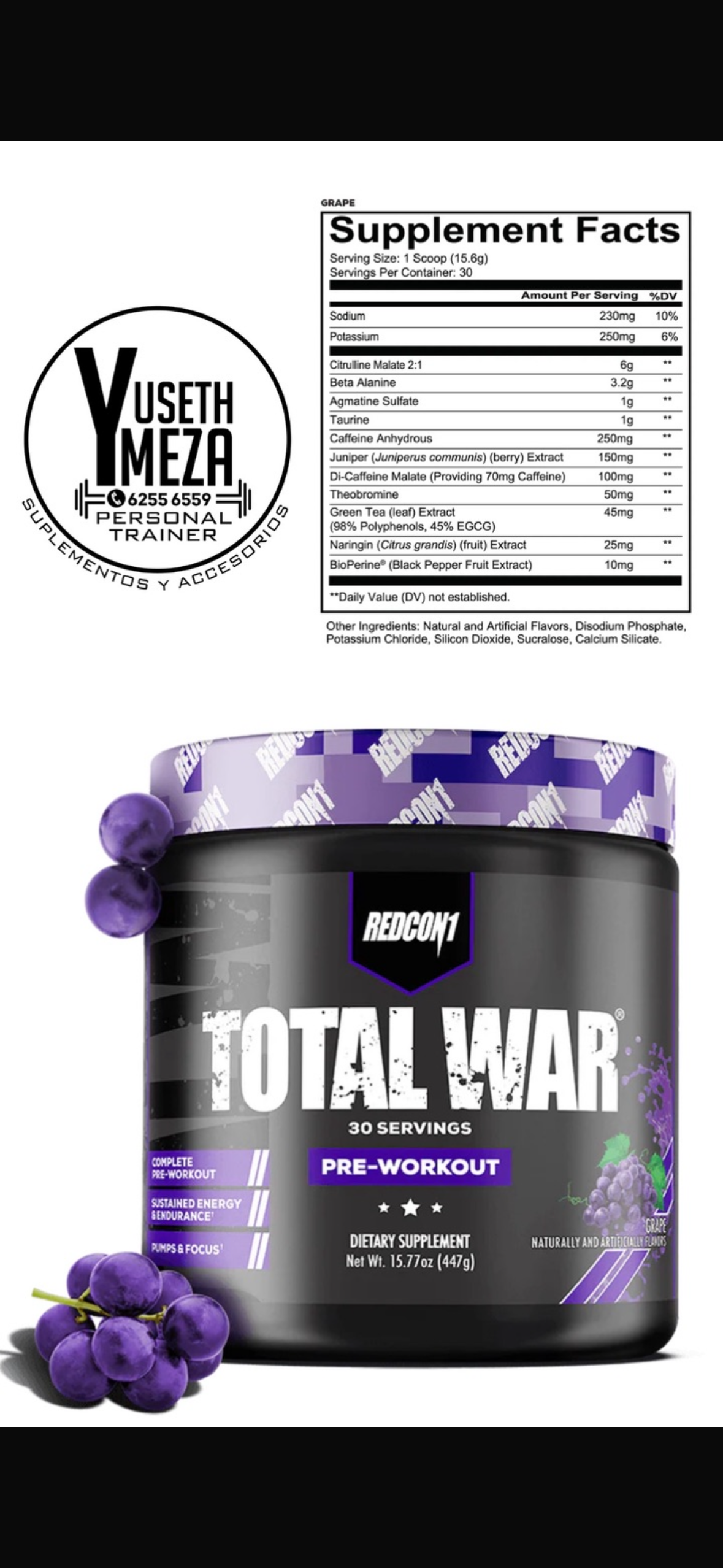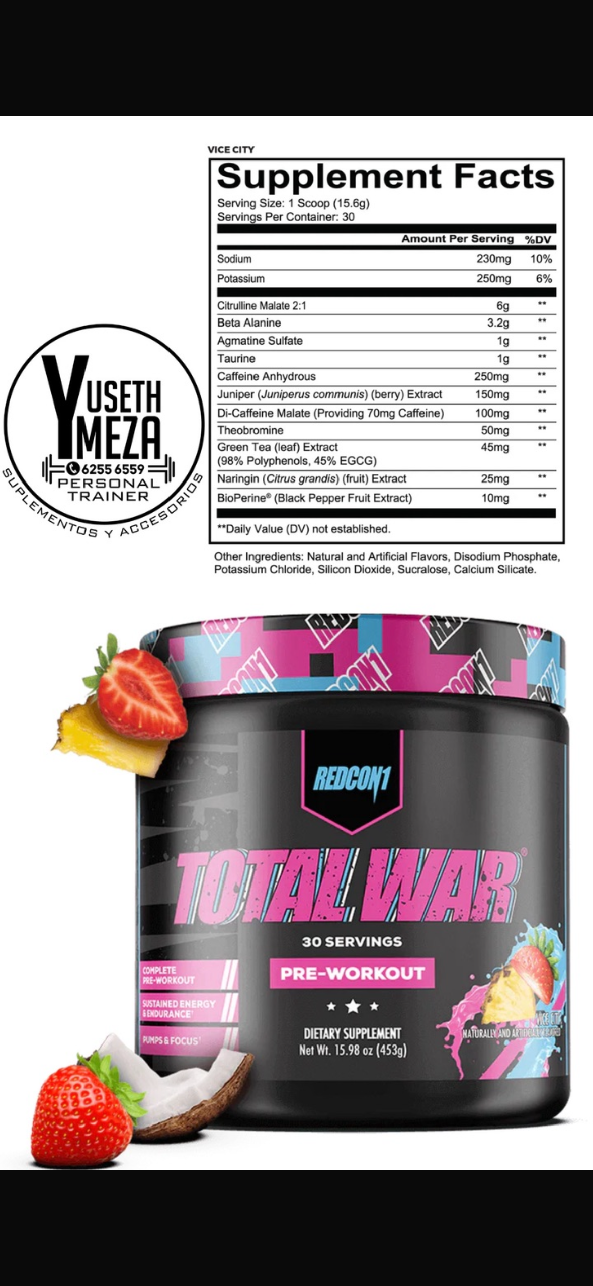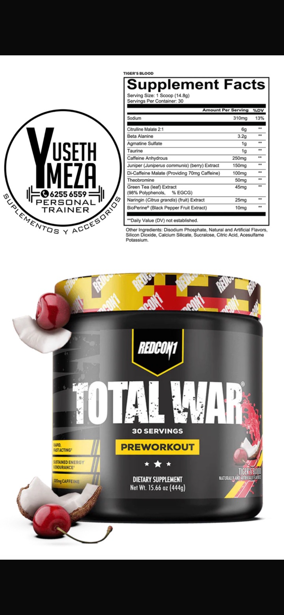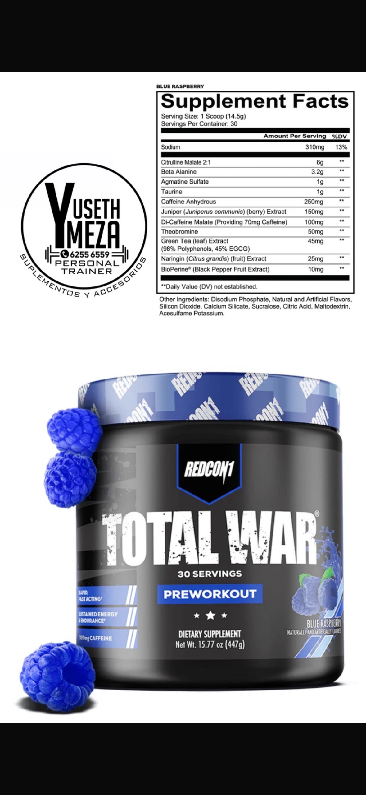 ¿Buscas el suplemento pre-entrenamiento definitivo para llevar tus entrenamientos al siguiente nivel? ¡Experimenta la fórmula previa al entrenamiento número 1 más vendida de REDCON1! TOTAL WAR es un polvo pre-entrenamiento todo en uno que contiene una poderosa combinación de factores de resistencia, bombeo, energía y enfoque. Con 320 mg de cafeína, 3,2 g de beta alanina y 6 g de malato de citrulina en el núcleo de la fórmula, cada cucharada de TOTAL WAR está cargada con ingredientes clínicamente investigados a niveles eficaces para que puedas entrenar a un nivel de élite, siempre.