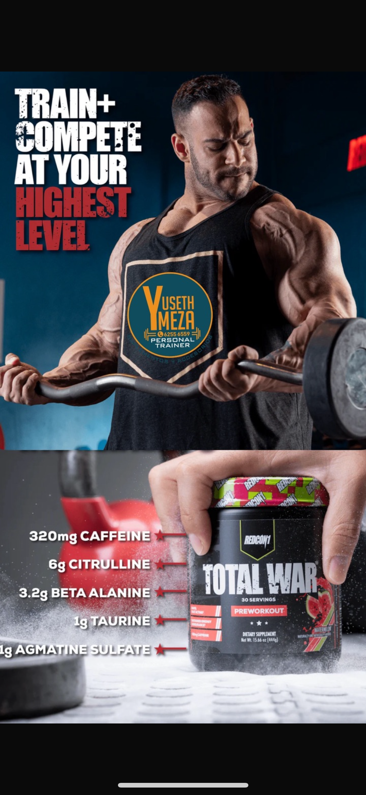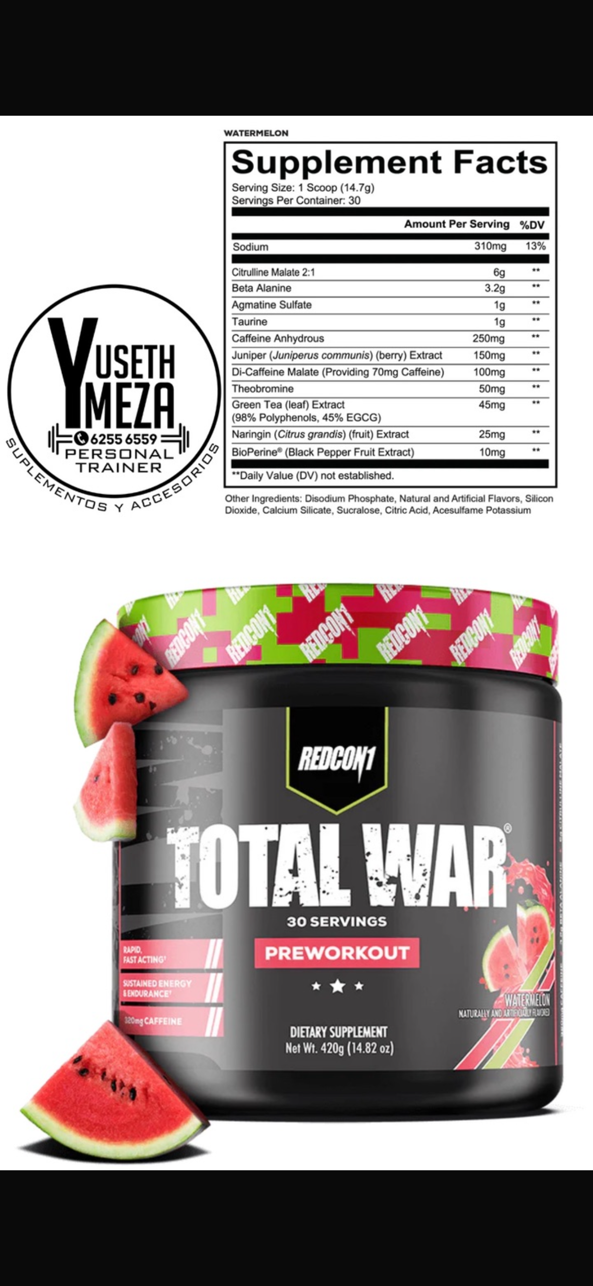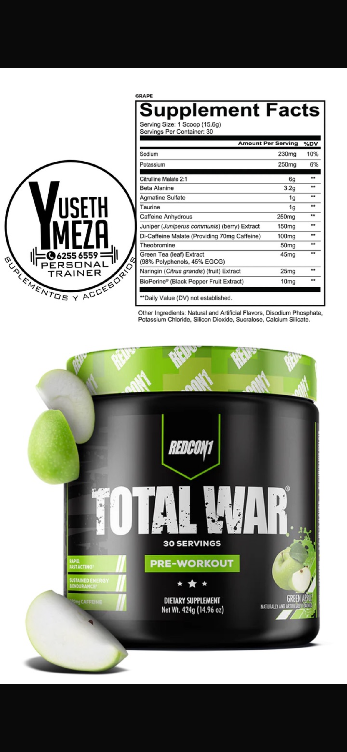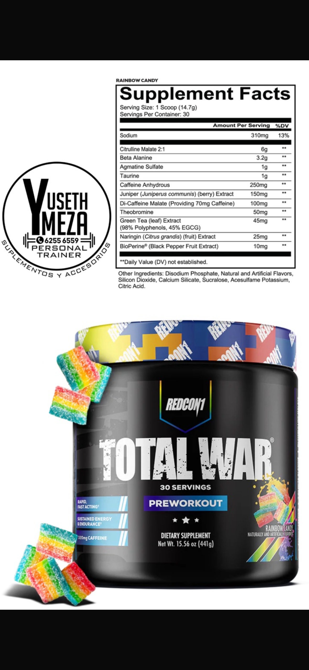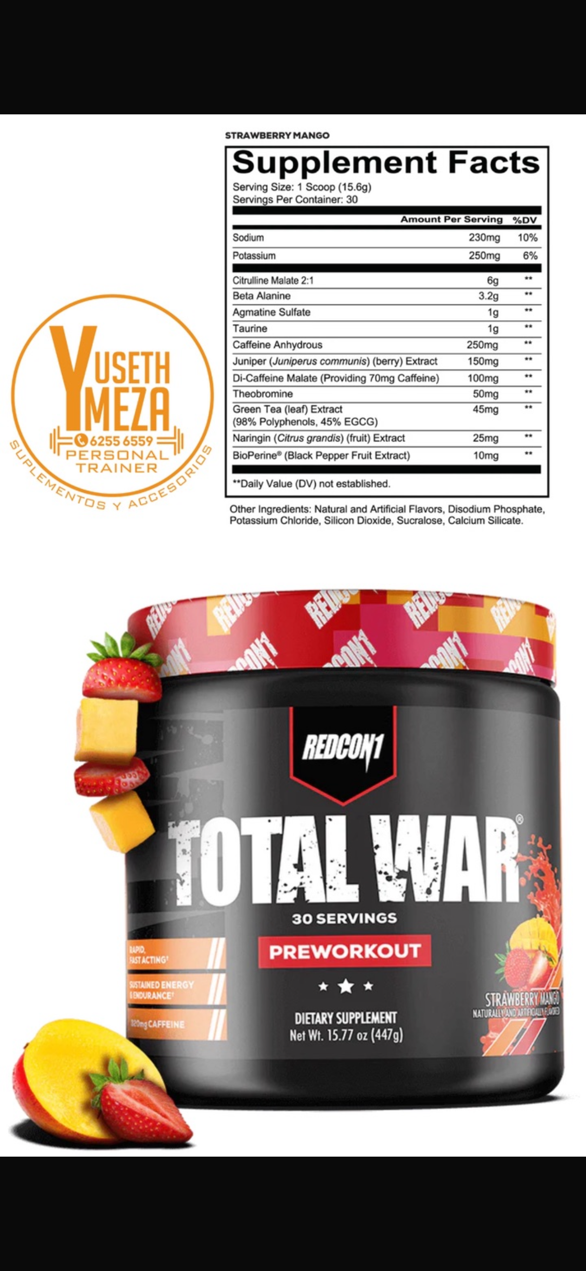 ¿Buscas el suplemento pre-entrenamiento definitivo para llevar tus entrenamientos al siguiente nivel? ¡Experimenta la fórmula previa al entrenamiento número 1 más vendida de REDCON1! TOTAL WAR es un polvo pre-entrenamiento todo en uno que contiene una poderosa combinación de factores de resistencia, bombeo, energía y enfoque. Con 320 mg de cafeína, 3,2 g de beta alanina y 6 g de malato de citrulina en el núcleo de la fórmula, cada cucharada de TOTAL WAR está cargada con ingredientes clínicamente investigados a niveles eficaces para que puedas entrenar a un nivel de élite, siempre.