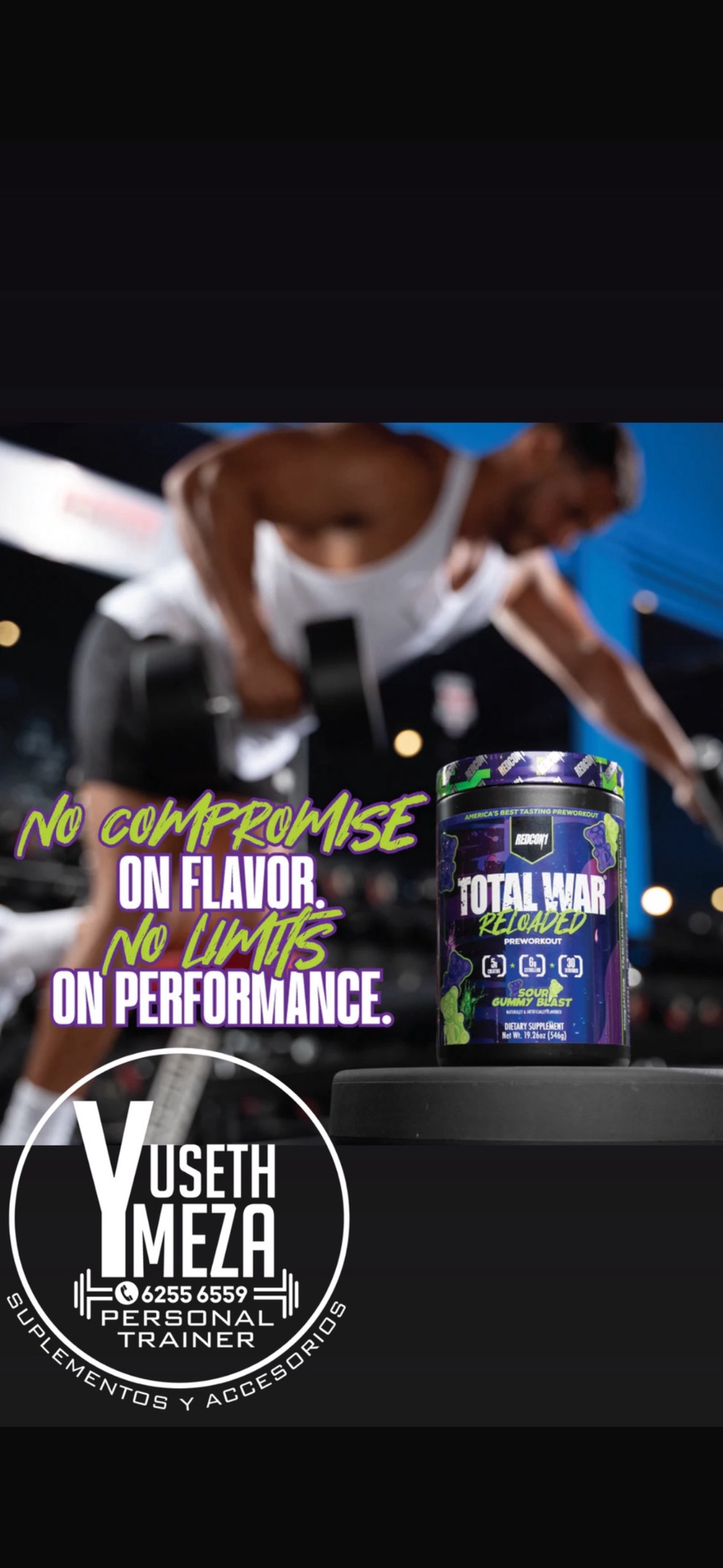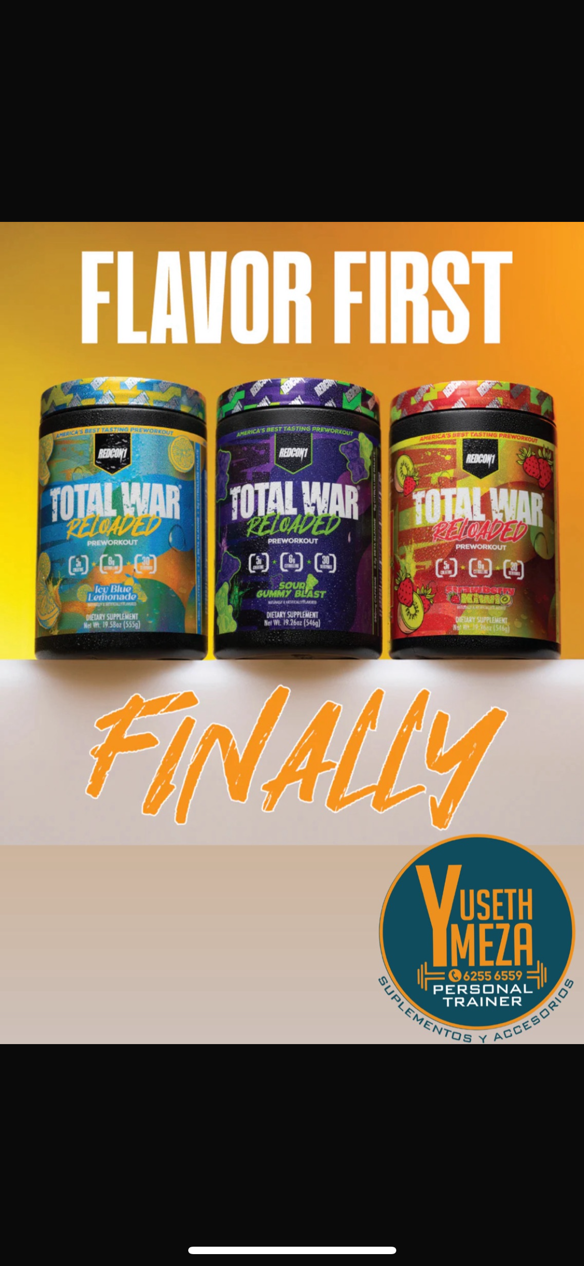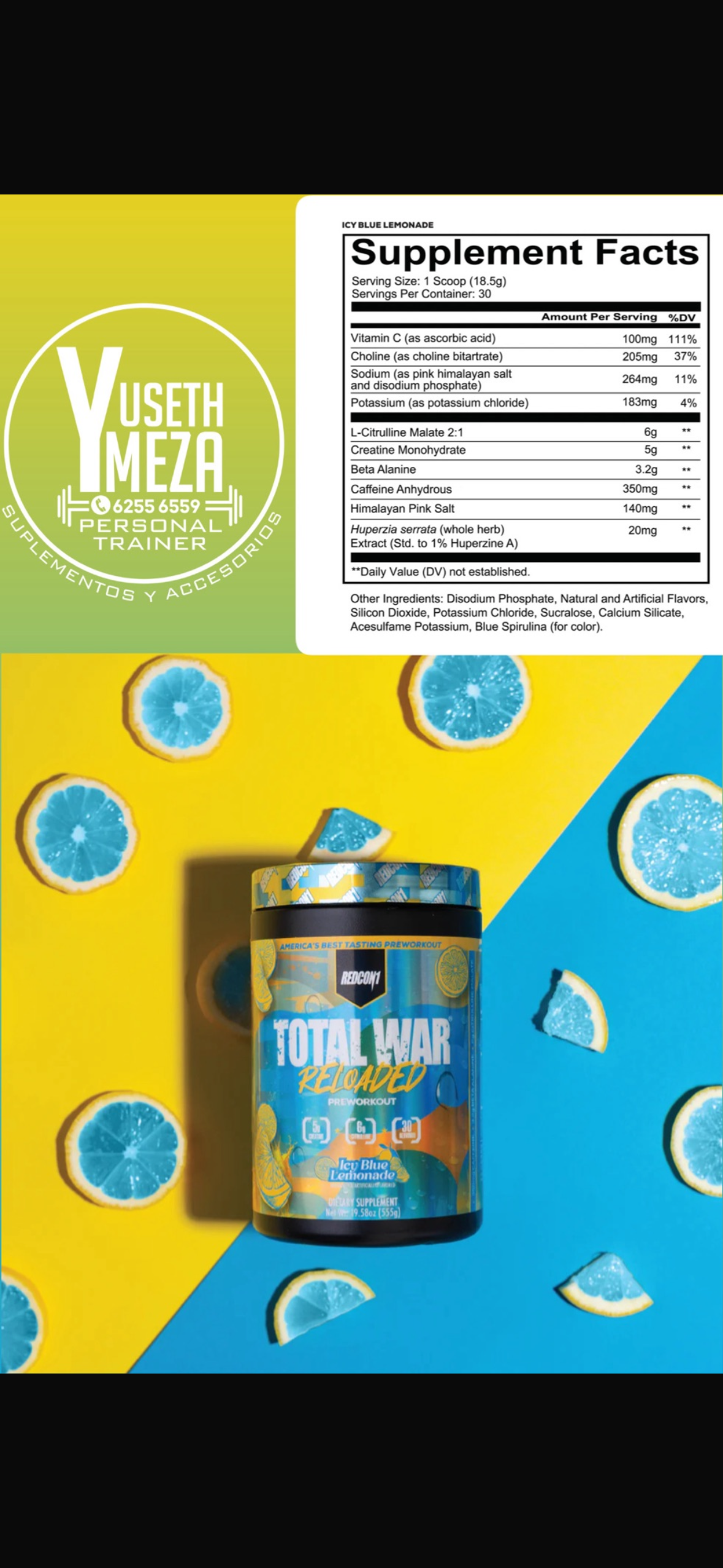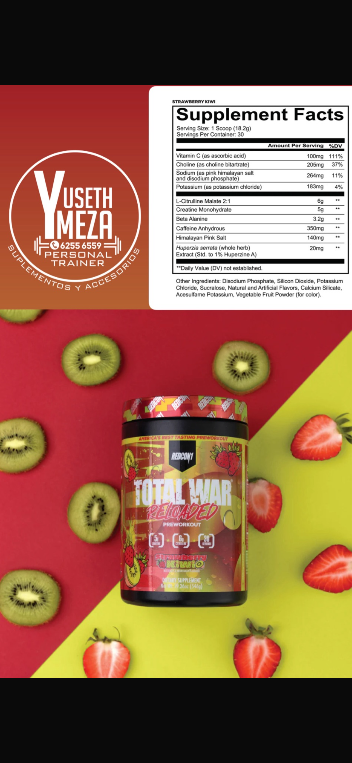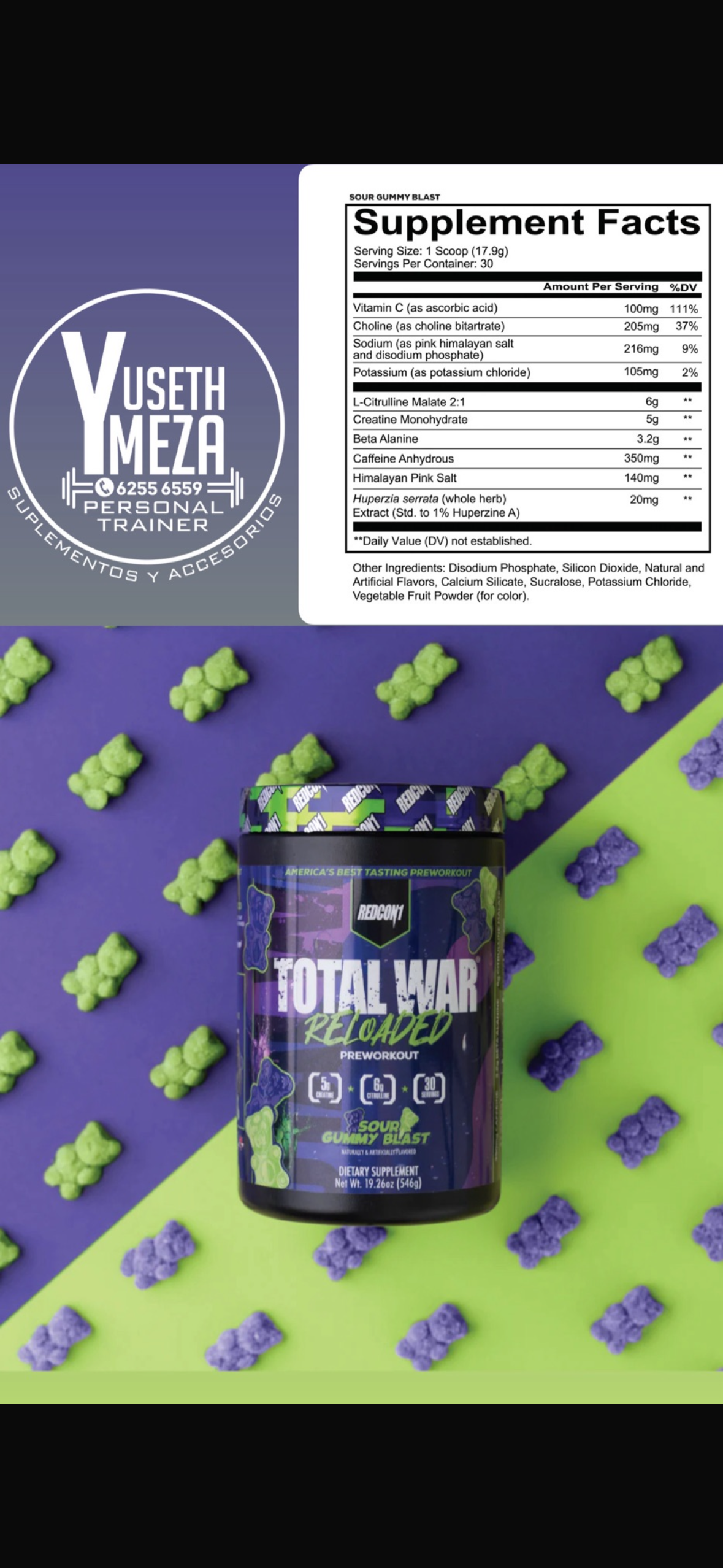 TOTAL WAR RELOADED mantiene su intensidad central, con 350 mg de cafeína, beta-alanina y malato de citrulina, todo clínicamente dosificado para proporcionar una concentración loca, energía y bombas que dividen la piel. Este ángulo está diseñado para resonar con levantadores y atletas serios que quieren que cada repetición golpee más fuerte y que cada primicia esté completamente optimizada.